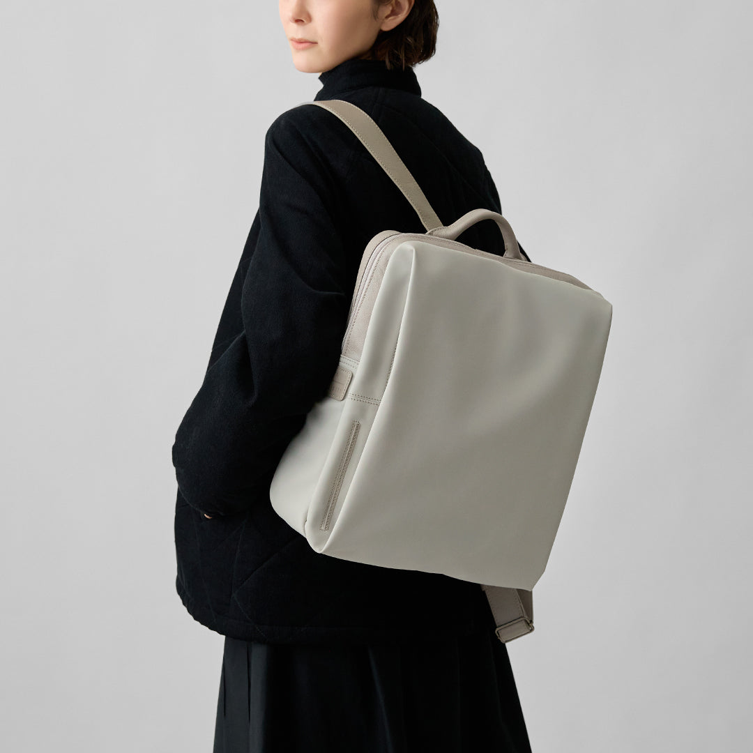 The clean, square silhouette holds a 13-inch laptop, and the water-resistant polyurethane keeps your essentials protected while remaining easy to care for.