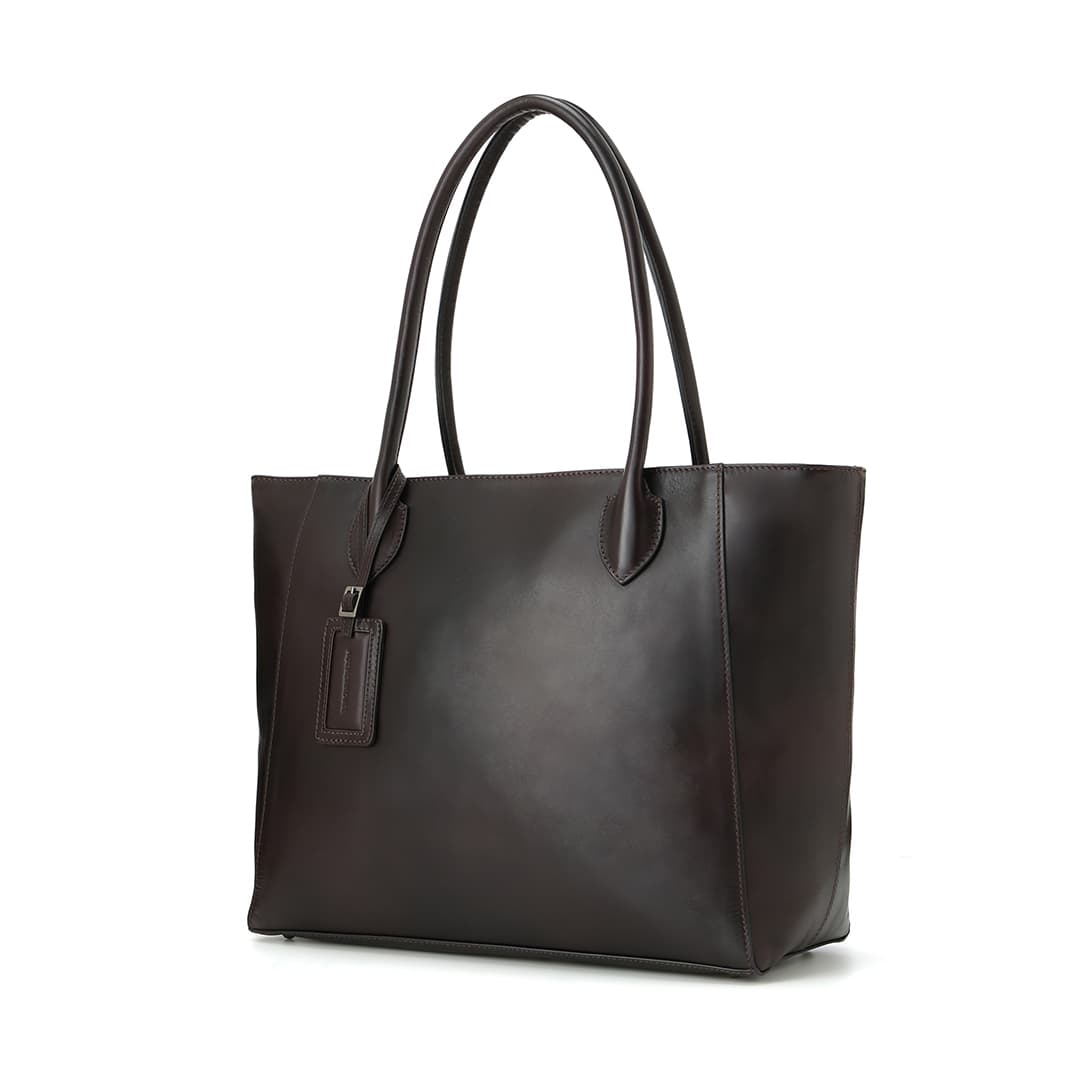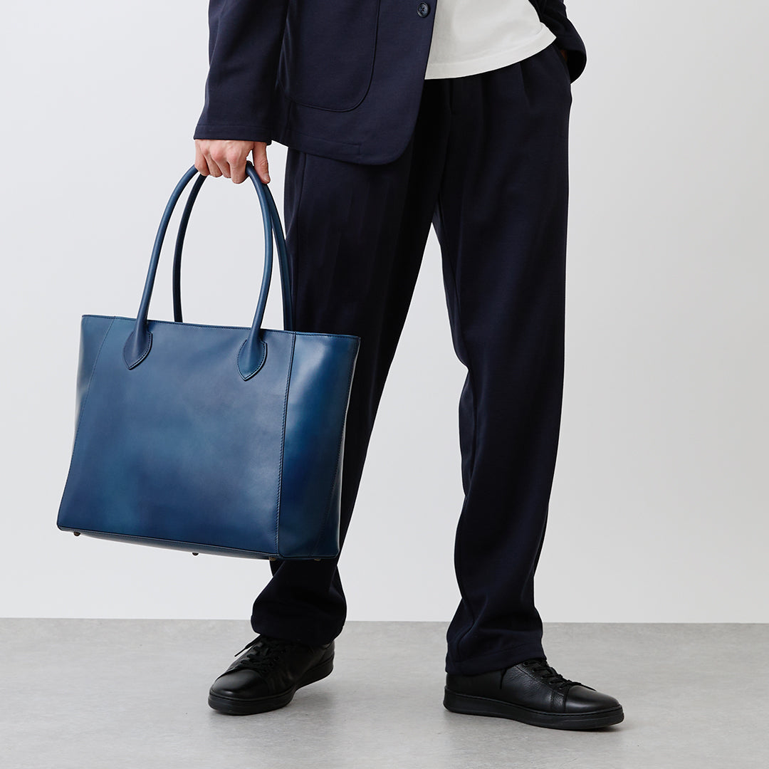 A large-capacity tote designed for everyday commuting, crafted from richly expressive antique leather. Spacious enough to serve as a reliable companion for overnight business trips or short travels, it combines practicality with refined style. The unique depth and tonal variations of the antique leather elevate the design, making it suitable for both work and casual settings. The main compartment comfortably fits laptops up to approximately 15 inches.