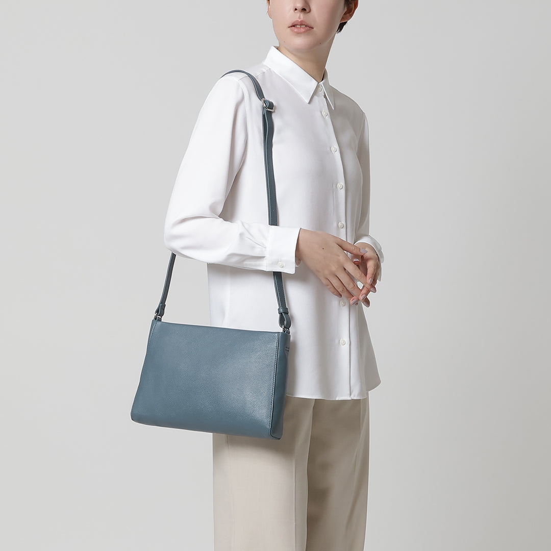 A shoulder bag with a simple form and comfortable fit. Outer pocket for convenient storage of smartphones and pass cases. Just the right size for daily outings, and can easily fit a 500ml plastic bottle sideways.