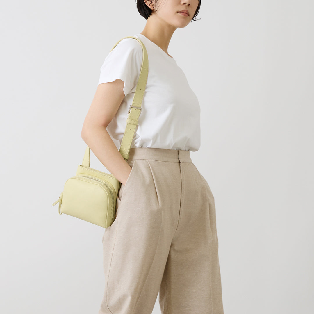 Sora has a unique shape that combines a circle and a square. It has an open pocket that you can quickly access like a pocket on your clothes, and it is a 2-way bag that can be used as a shoulder bag or a waist Pouch. The shoulder strap is designed to move freely, so you can use it according to your own style. The small S size has a compact design that fits in with any style.