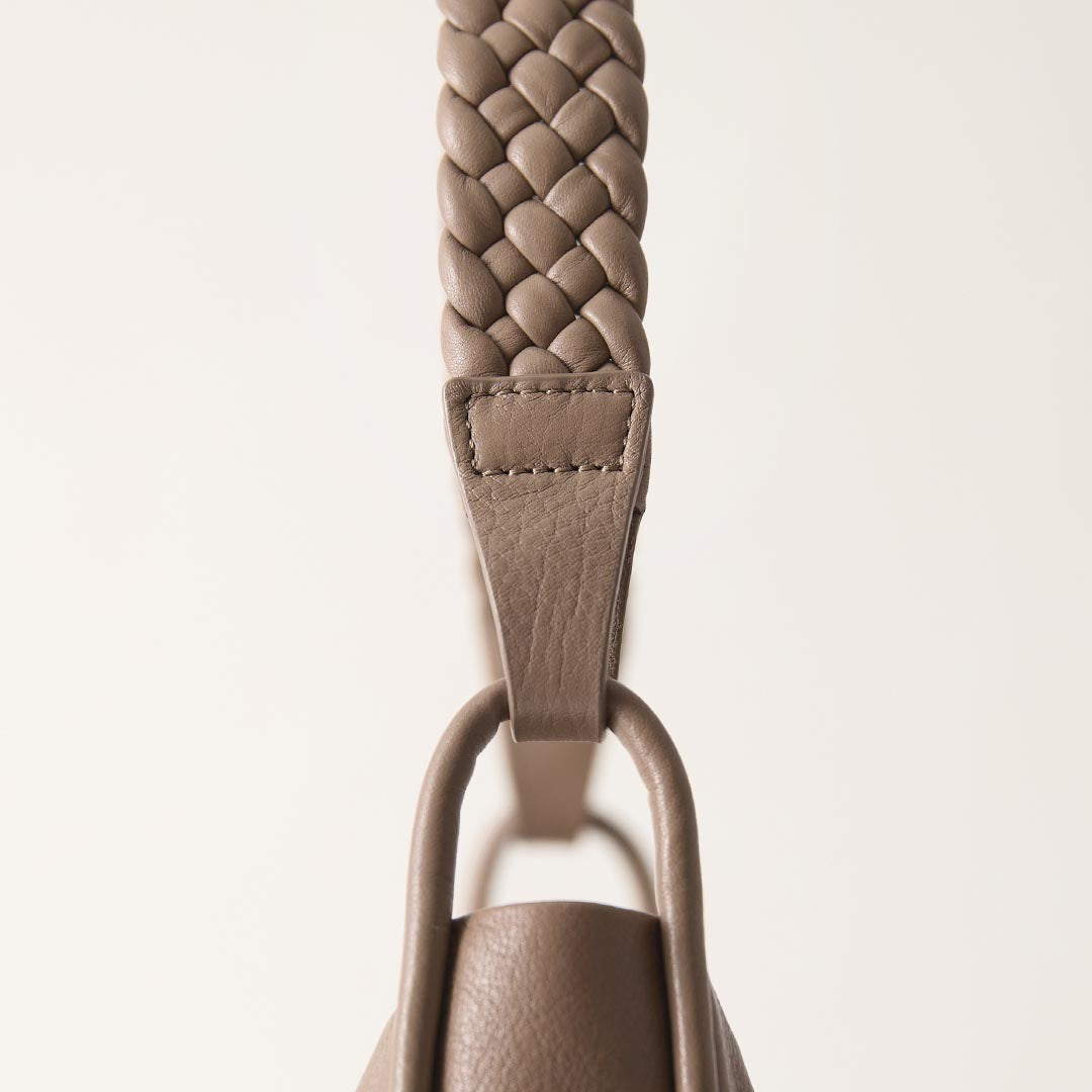 The handle, a key design feature, is meticulously hand-braided from individual leather ropes. Through careful experimentation with the braiding technique and the number of ropes, we kept it from becoming bulky while enhancing both the bag’s aesthetic appeal and comfort on the shoulder. Every detail is thoughtfully crafted so that even when the handle falls forward, it creates a visually striking silhouette.