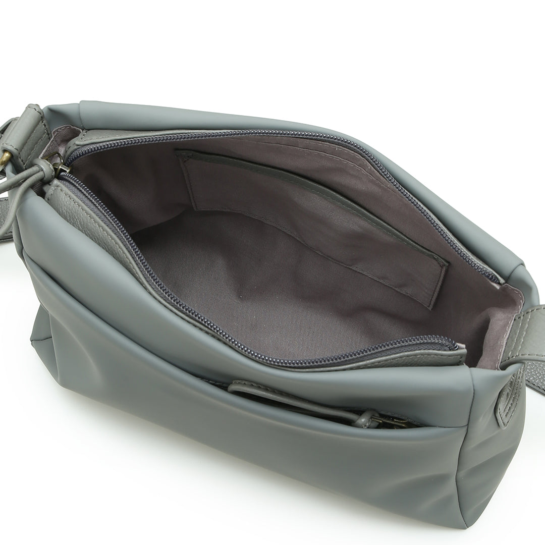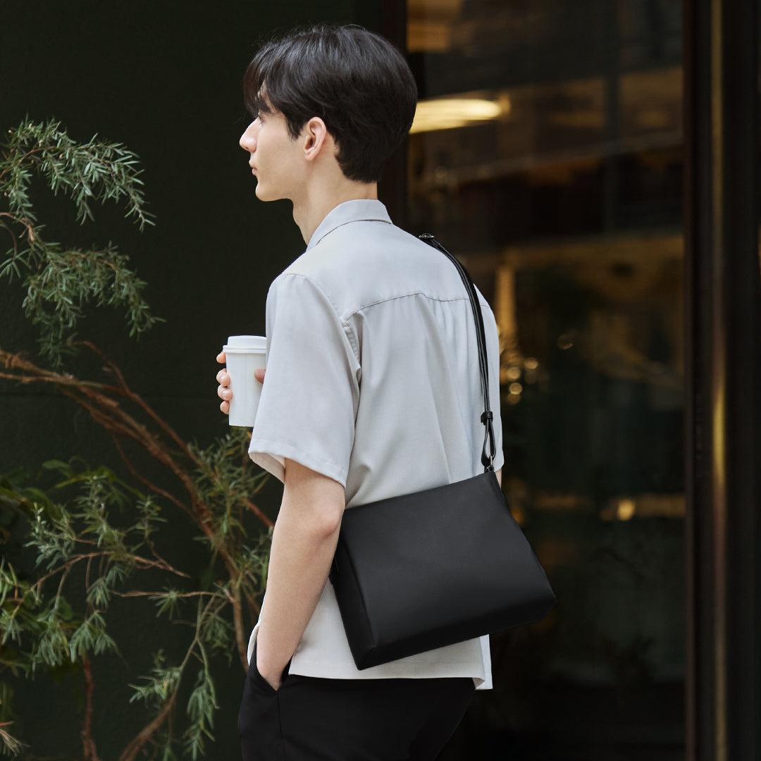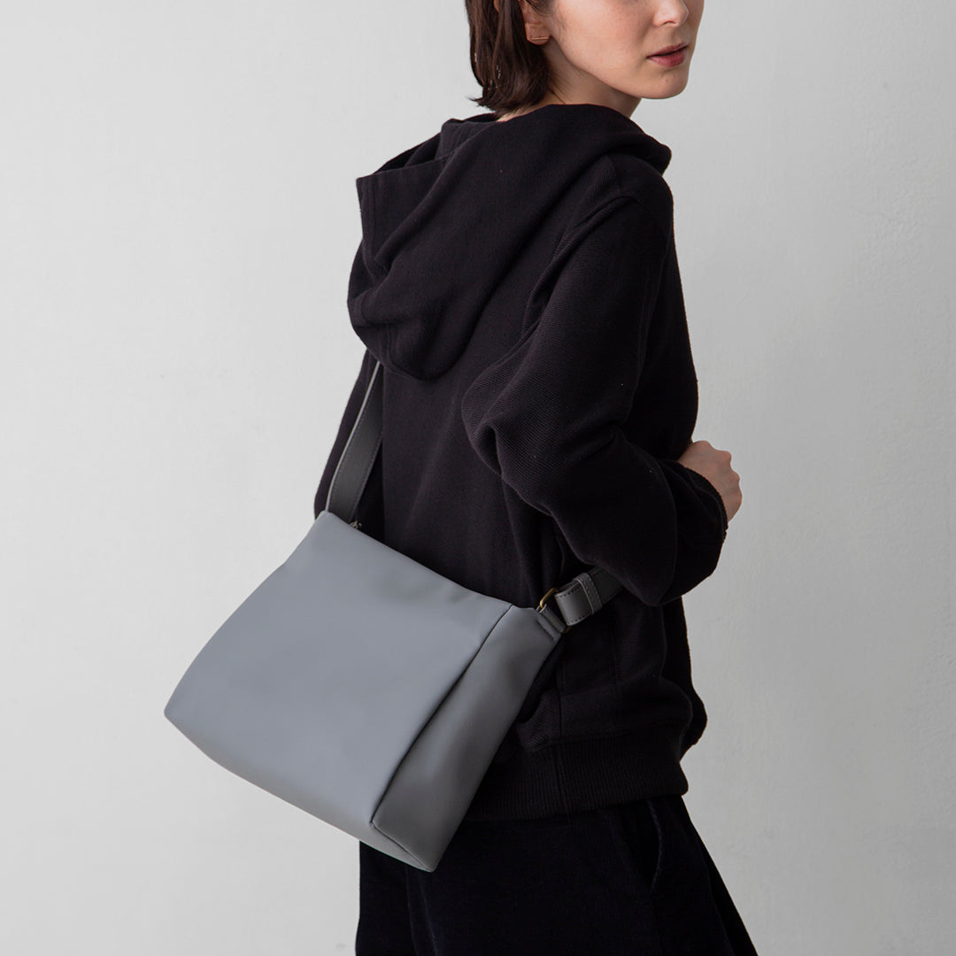 A shoulder bag crafted from water-repellent, easy-to-handle polyurethane with a sleek, refined design. Its softly rounded shape and minimal design, with a zipper hidden from the front view, blend seamlessly with polished, smart-casual outfits.