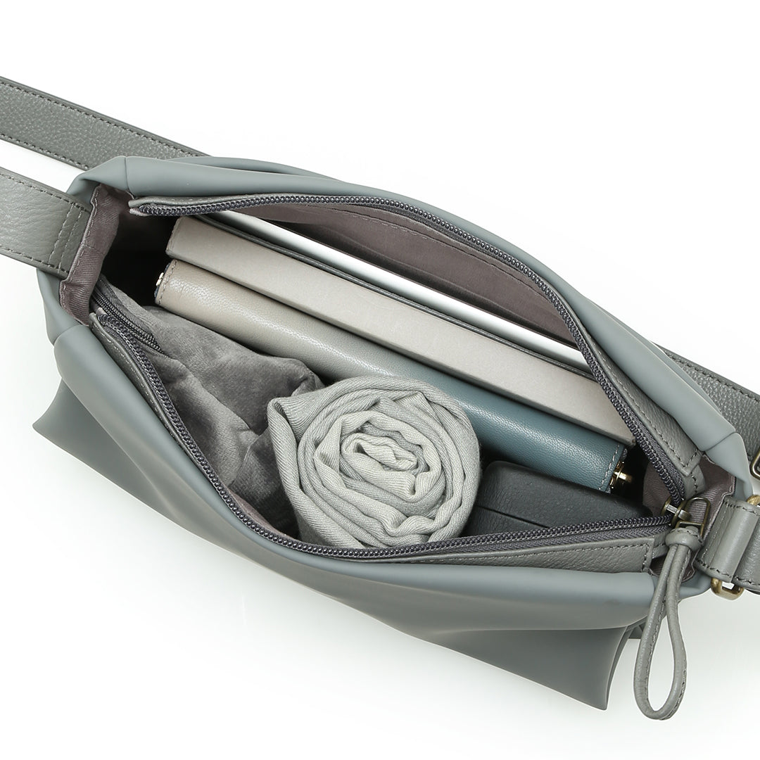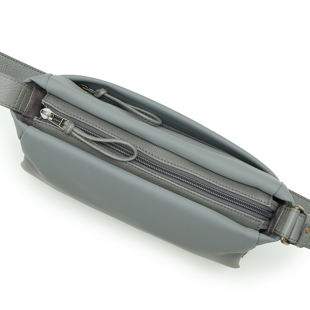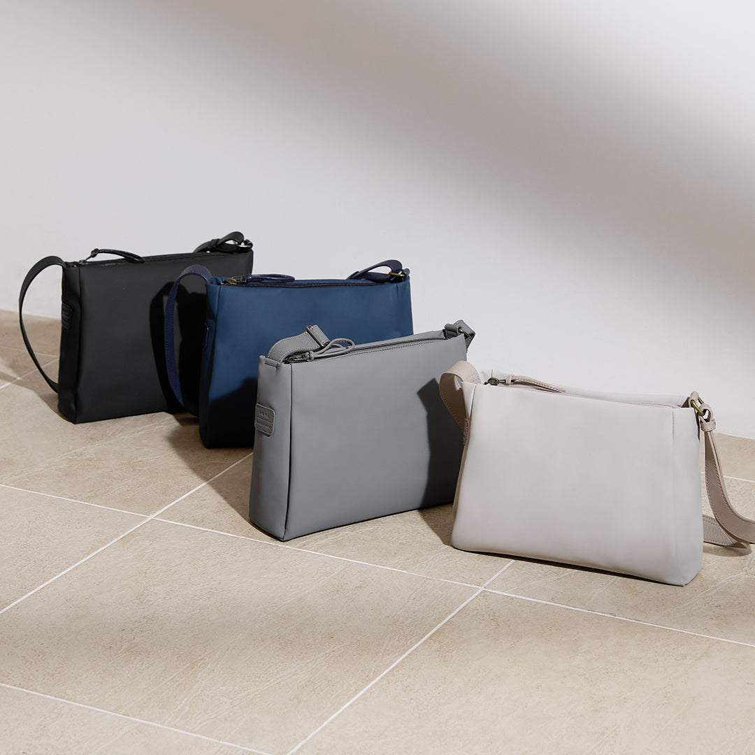 A shoulder bag crafted from water-repellent, easy-to-handle polyurethane with a sleek, refined design. Its softly rounded shape and minimal design, with a zipper hidden from the front view, blend seamlessly with polished, smart-casual outfits.