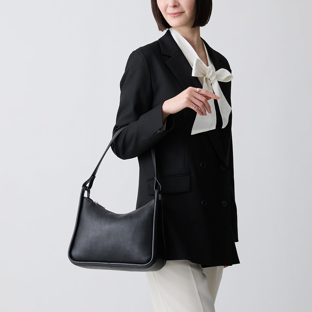 Soft, light, and supple, this 2-way handbag features a neat square shape that fits comfortably to the body.