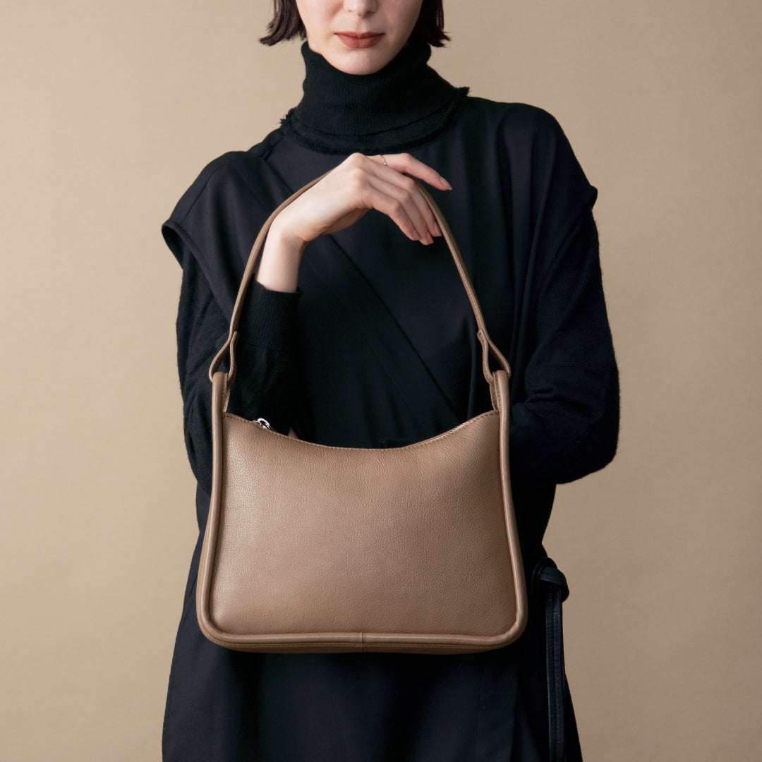 A soft, light, and supple texture. A neat, square-shaped 2-way tote bag that fits comfortably to the body.