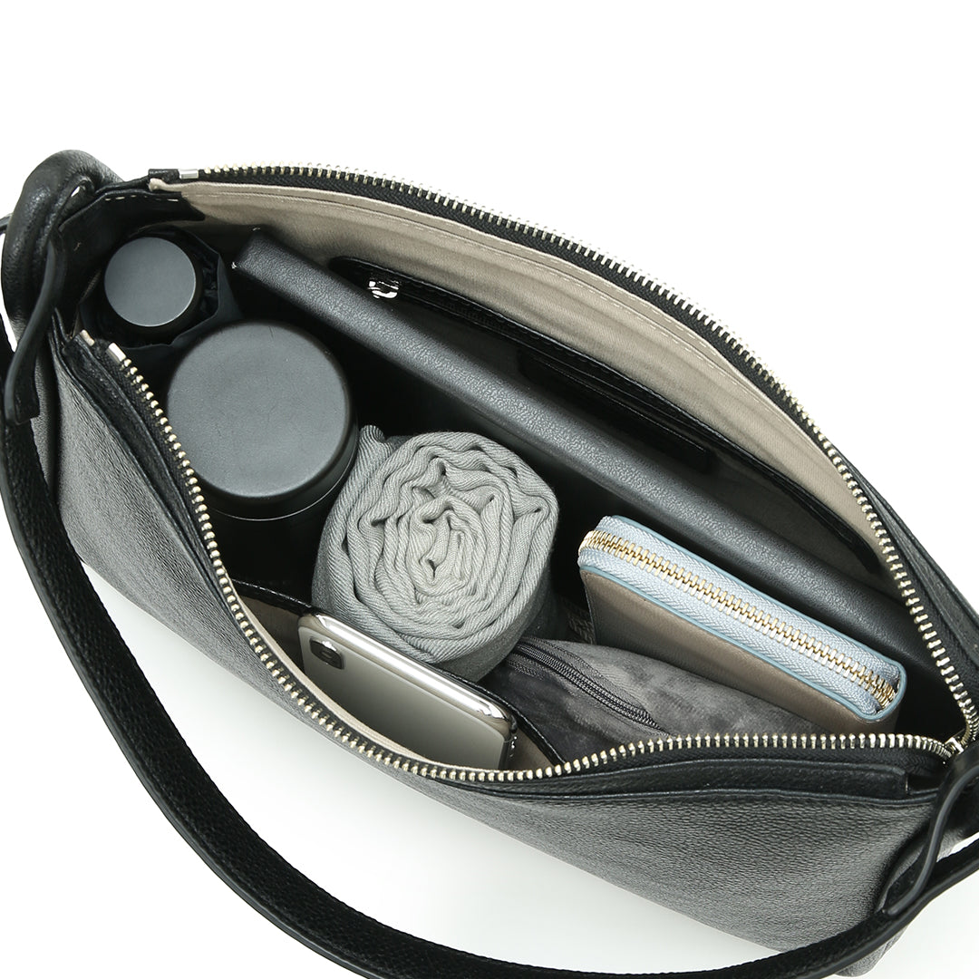 The flat handle has just the right thickness to fit comfortably on the shoulder. The curves of the top gusset and handle flow smoothly together, allowing the bag to fit comfortably around your body.