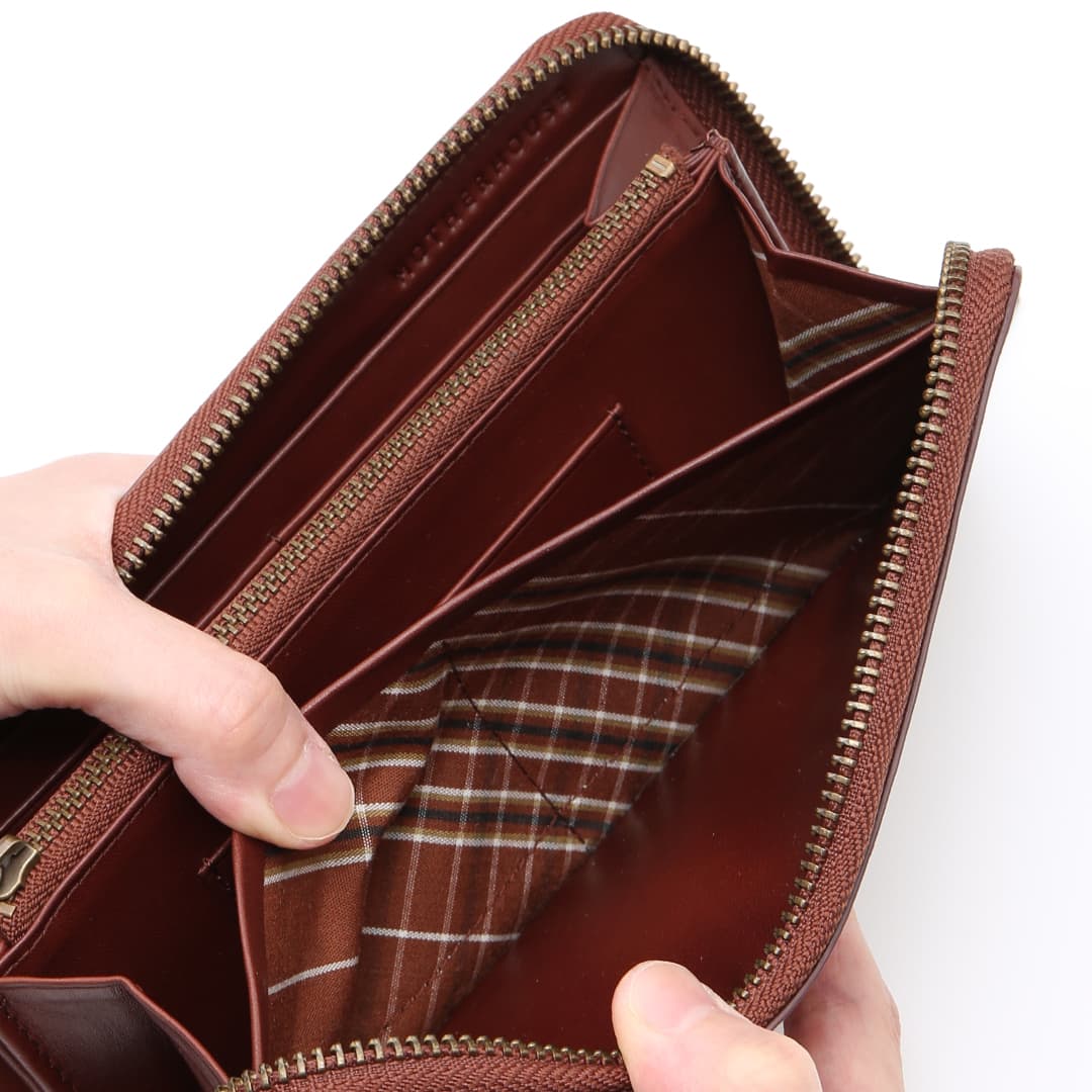 This round long wallet is made from expressive antique leather. It opens wide in a U-shape, making it easy to see and take out the contents. This basic long wallet allows you to enjoy the high quality feel of the leather, and is also recommended as a gift.